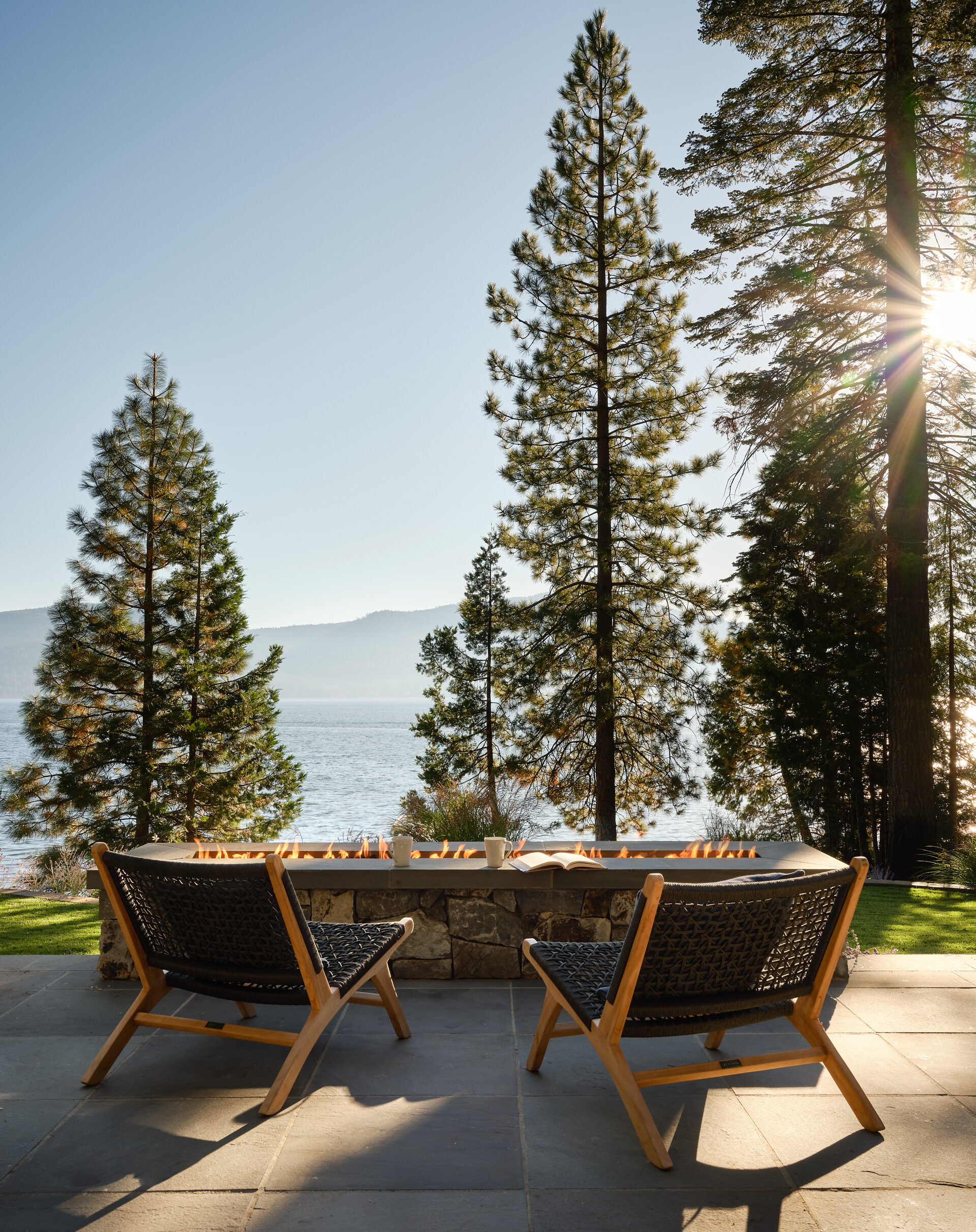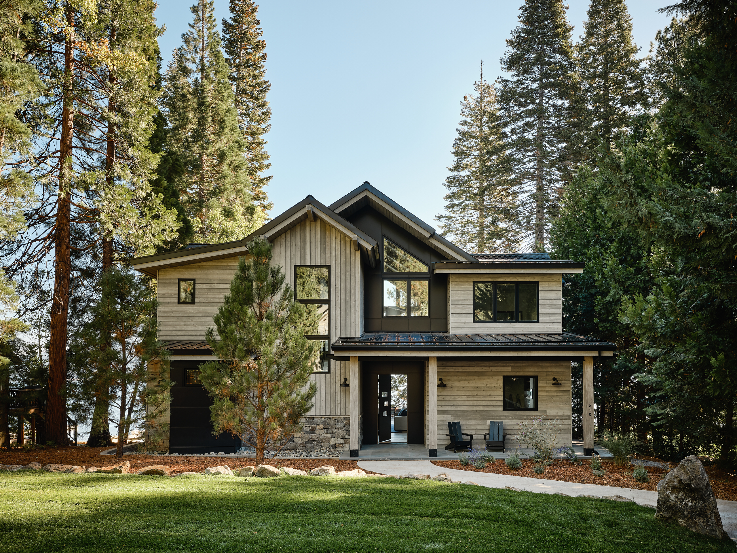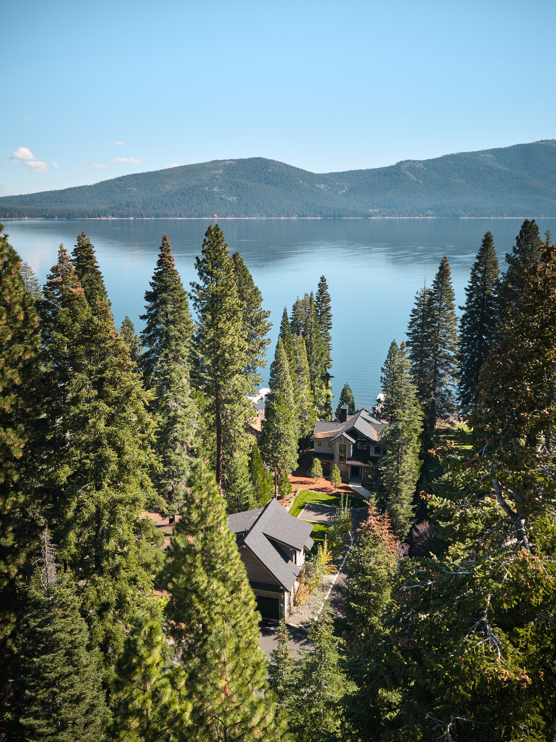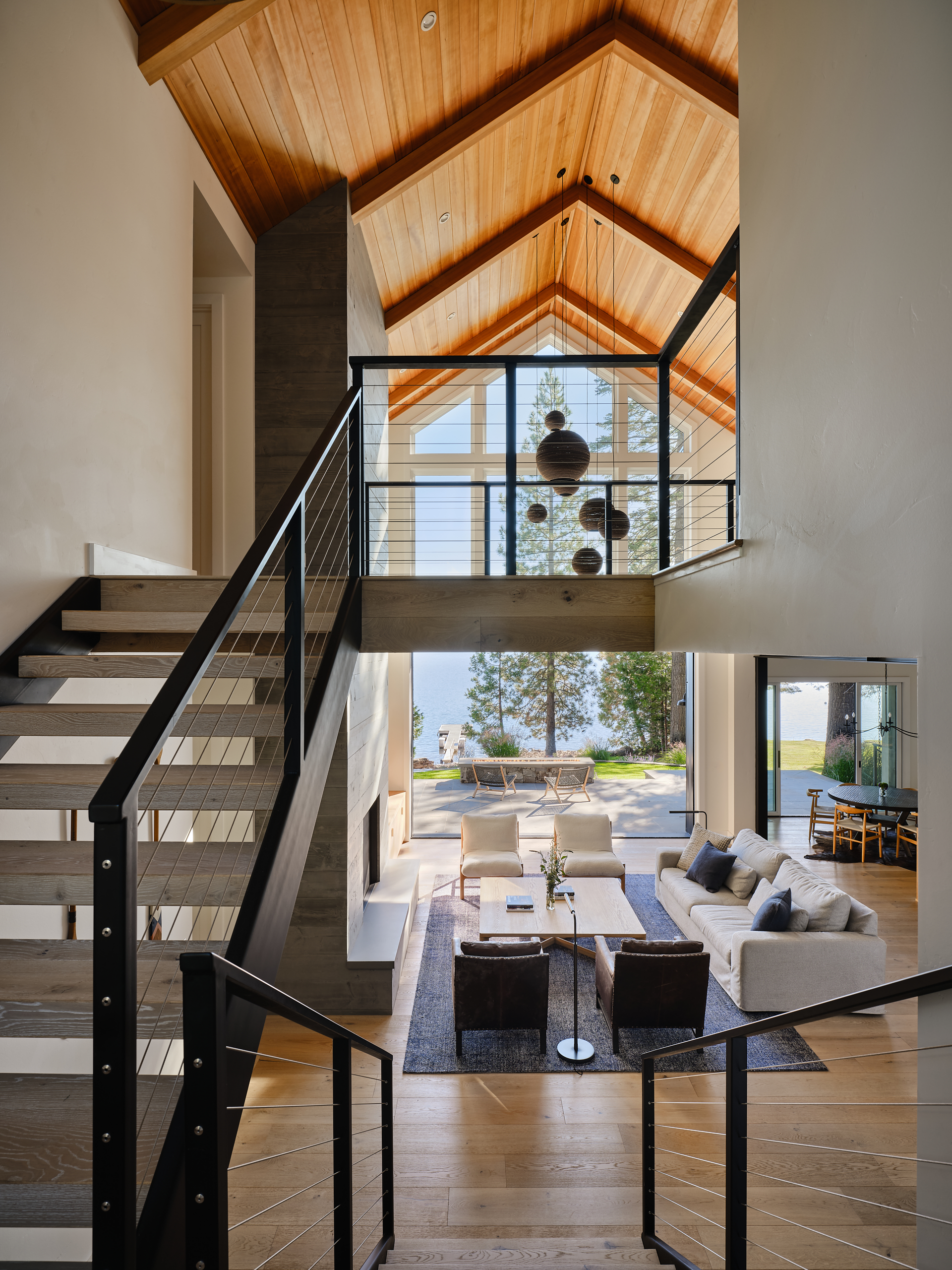 The Lake Almanor Getaway is designed for entertaining and making the most of lake-life living. The windows frame beautiful views of the lake, while generous outdoor spaces invite you to relax, play, and gather with friends and family. The living room opens directly to the landscaped backyard that borders the shores of Lake Almanor, creating a seamless indoor/outdoor connection, ideal for hosting and enjoying warm summer lake days. When winter settles in, you can bundle up beside the fireplace or head outside to roast marshmallows over the firepit.