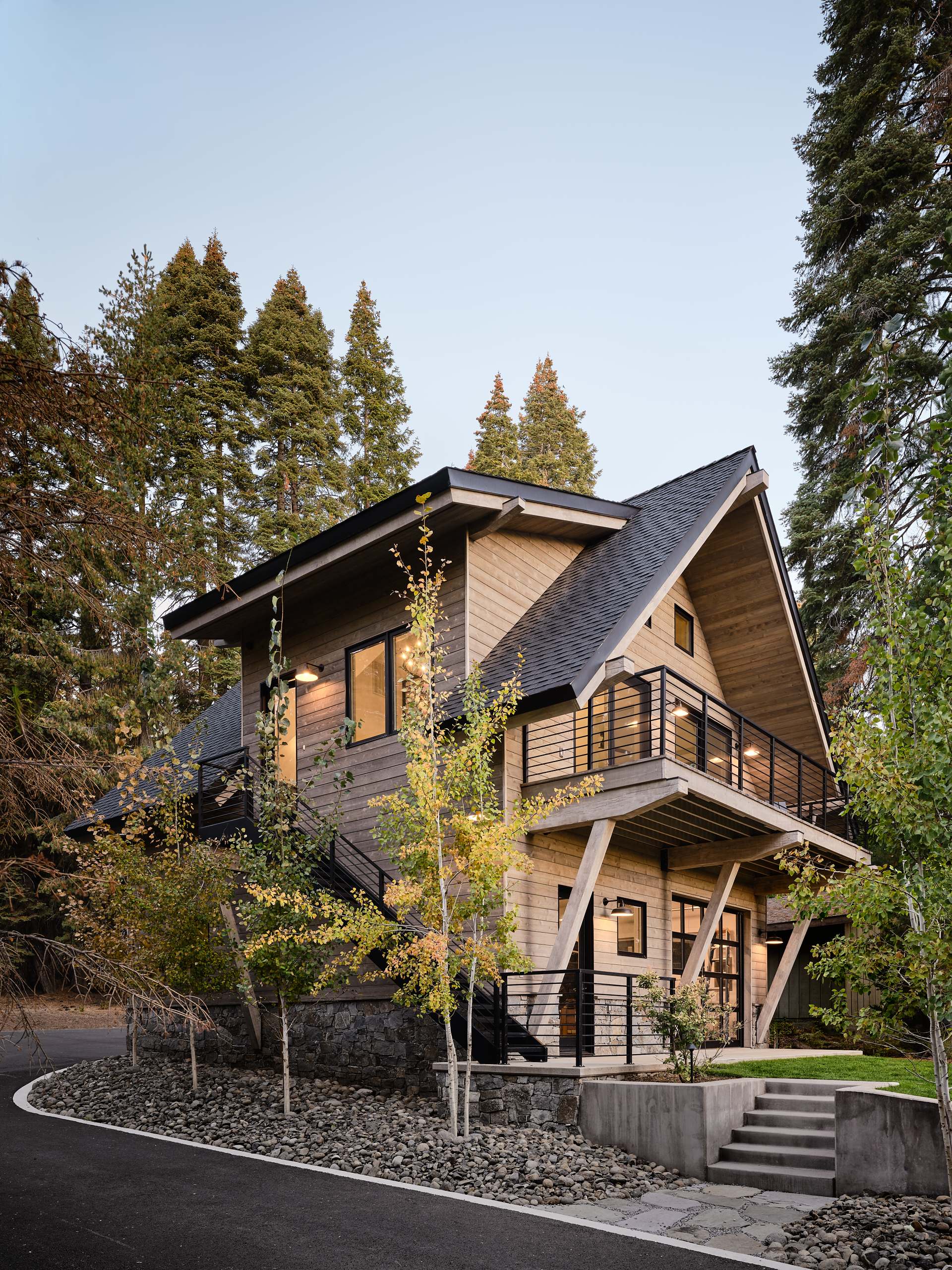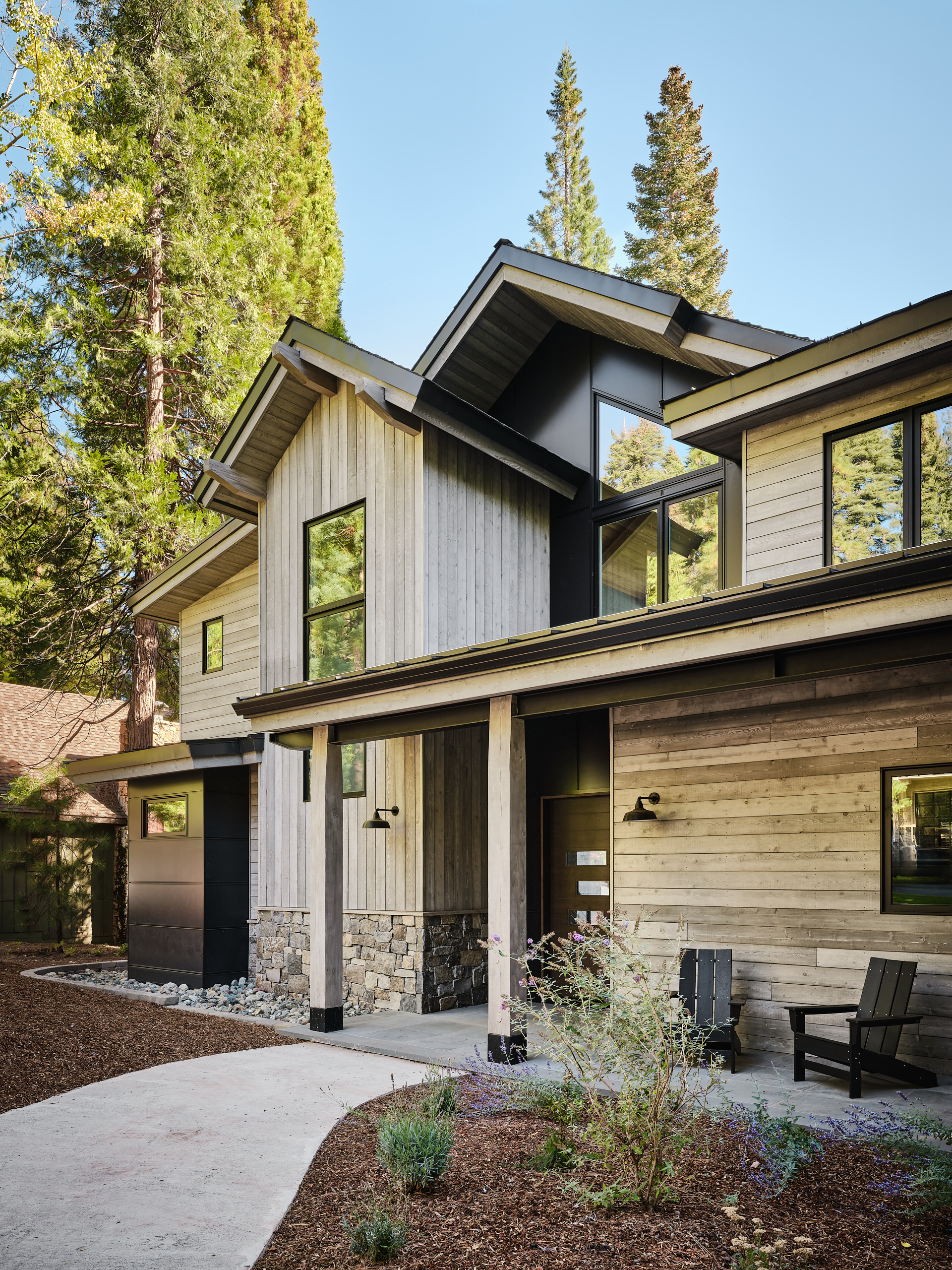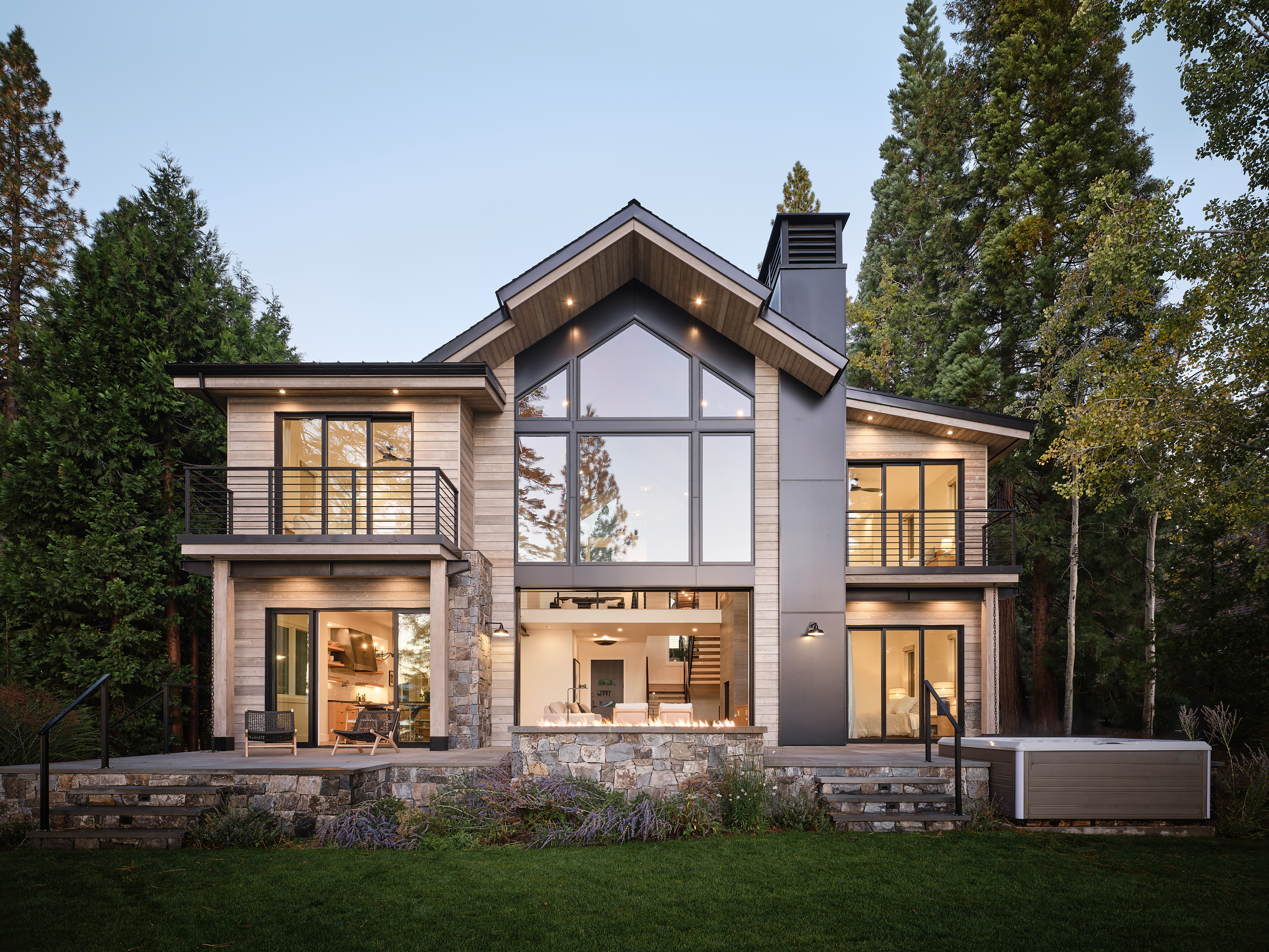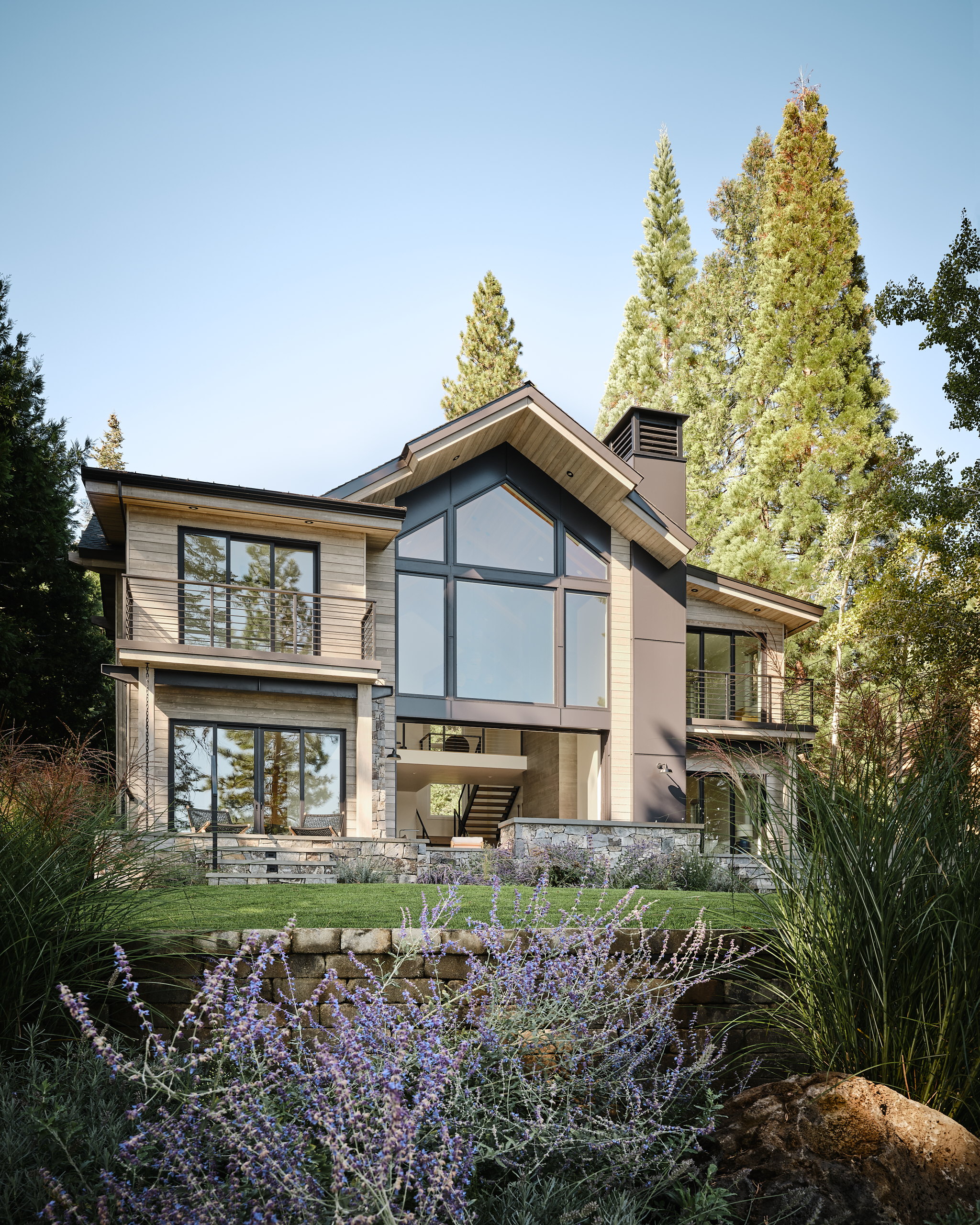 The Lake Almanor Getaway is designed for entertaining and making the most of lake-life living. The windows frame beautiful views of the lake, while generous outdoor spaces invite you to relax, play, and gather with friends and family. The living room opens directly to the landscaped backyard that borders the shores of Lake Almanor, creating a seamless indoor/outdoor connection, ideal for hosting and enjoying warm summer lake days. When winter settles in, you can bundle up beside the fireplace or head outside to roast marshmallows over the firepit.