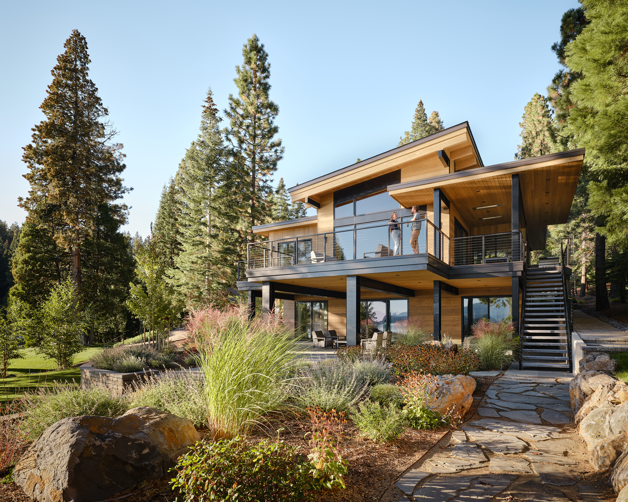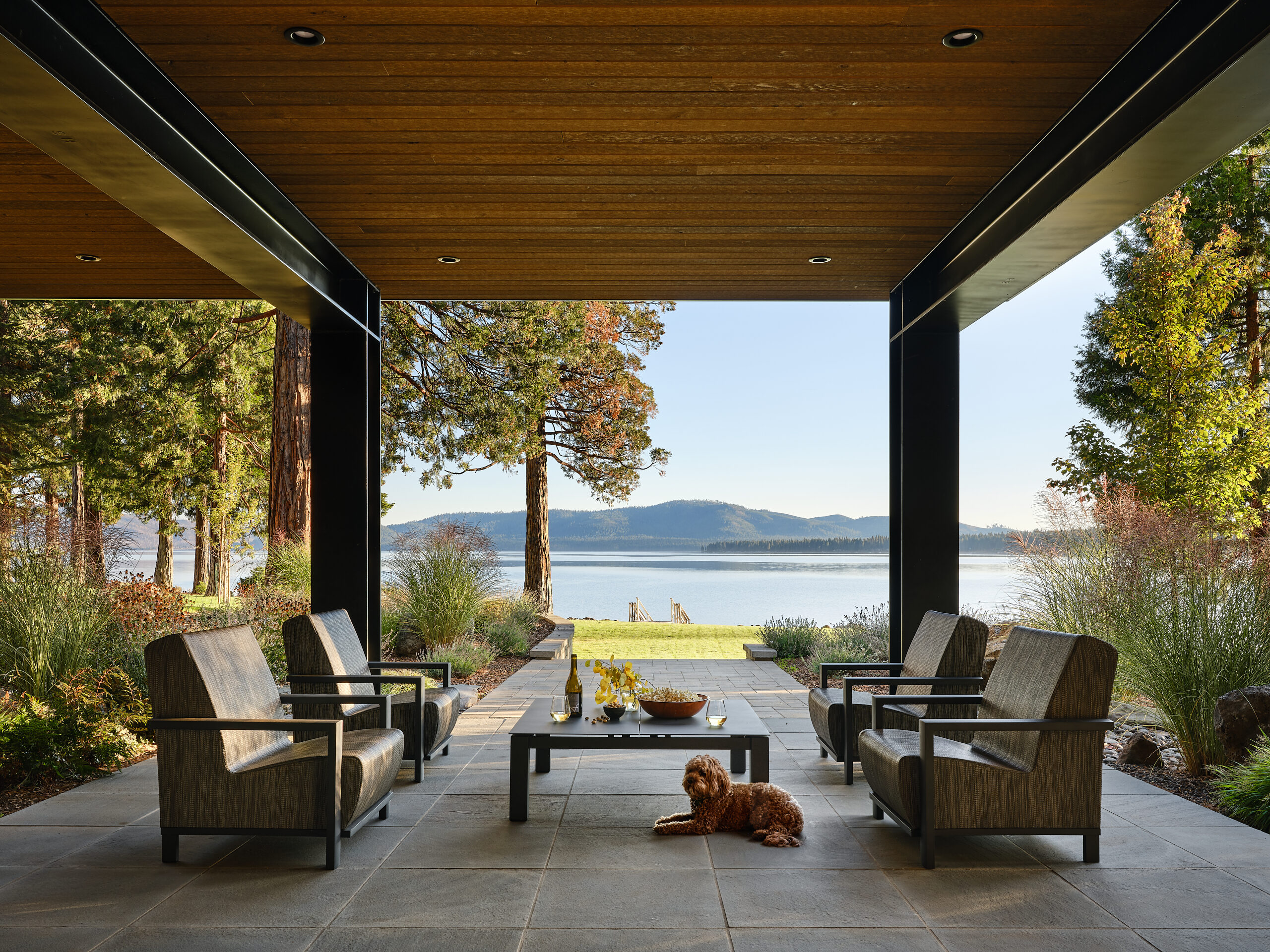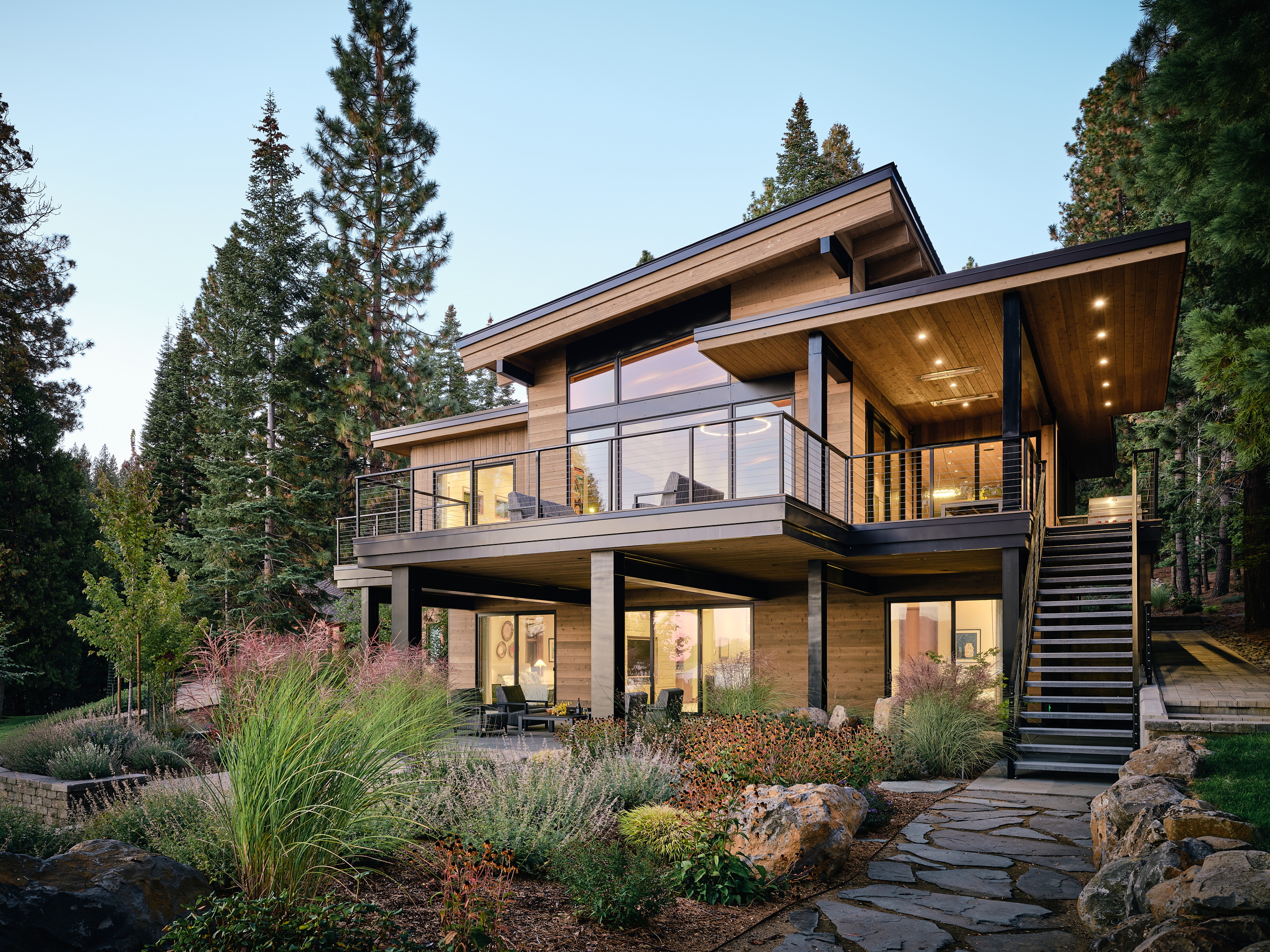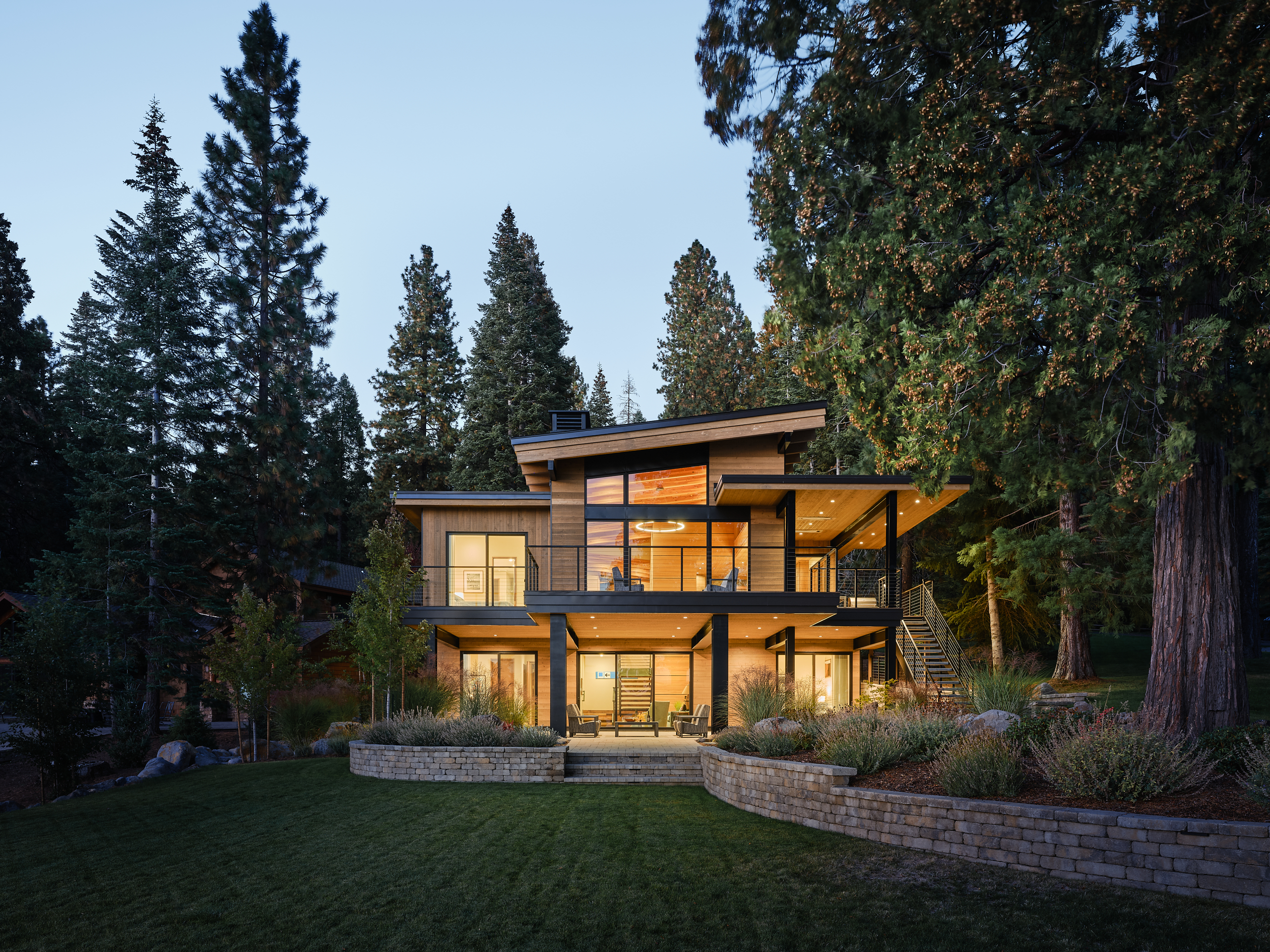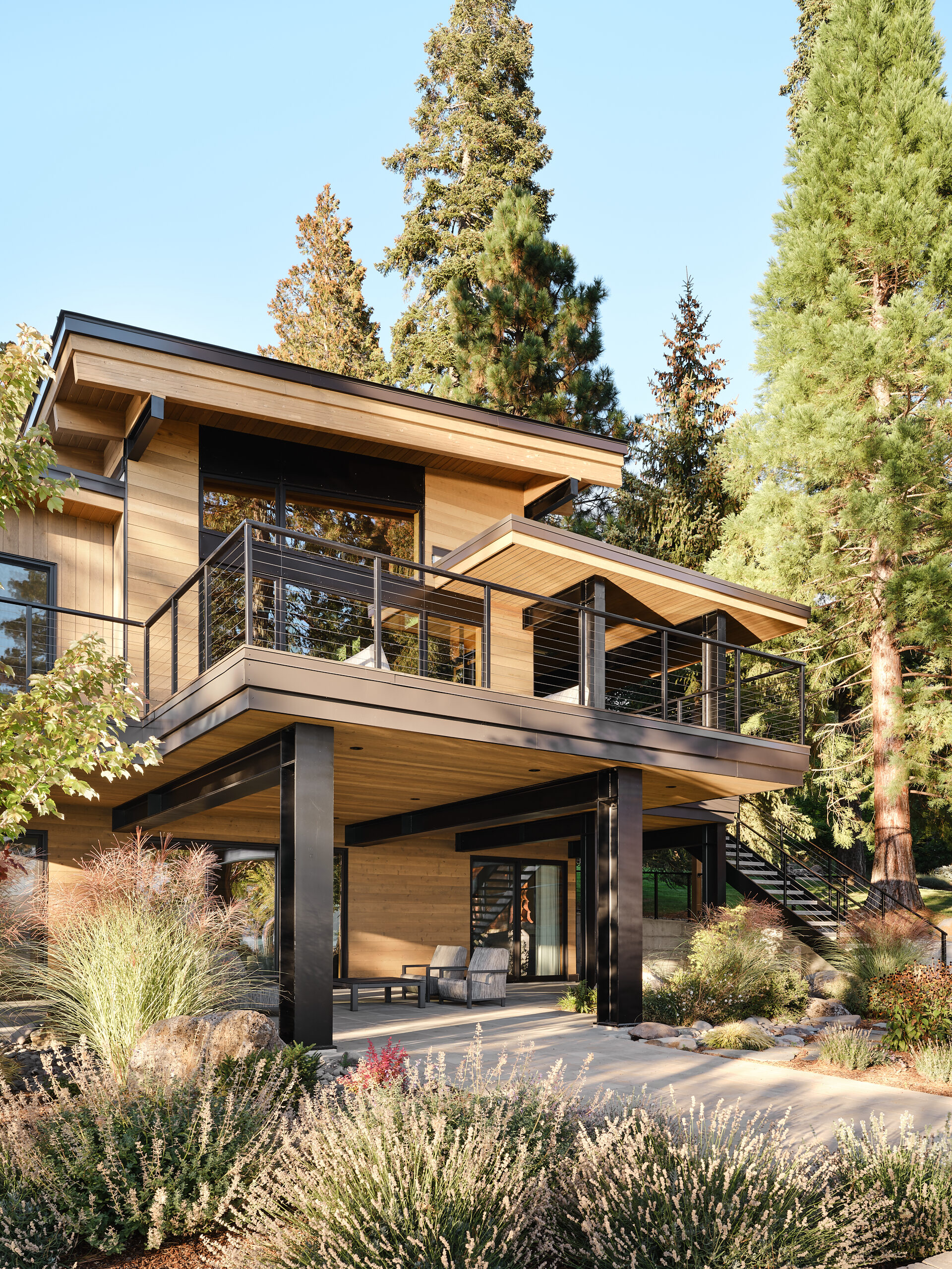 This modern lakeside home on Lake Almanor combines contemporary design with natural beauty. Featuring warm wood siding, sleek black steel accents, and expansive glass walls, the design embraces the breathtaking lake and mountain views from every angle.