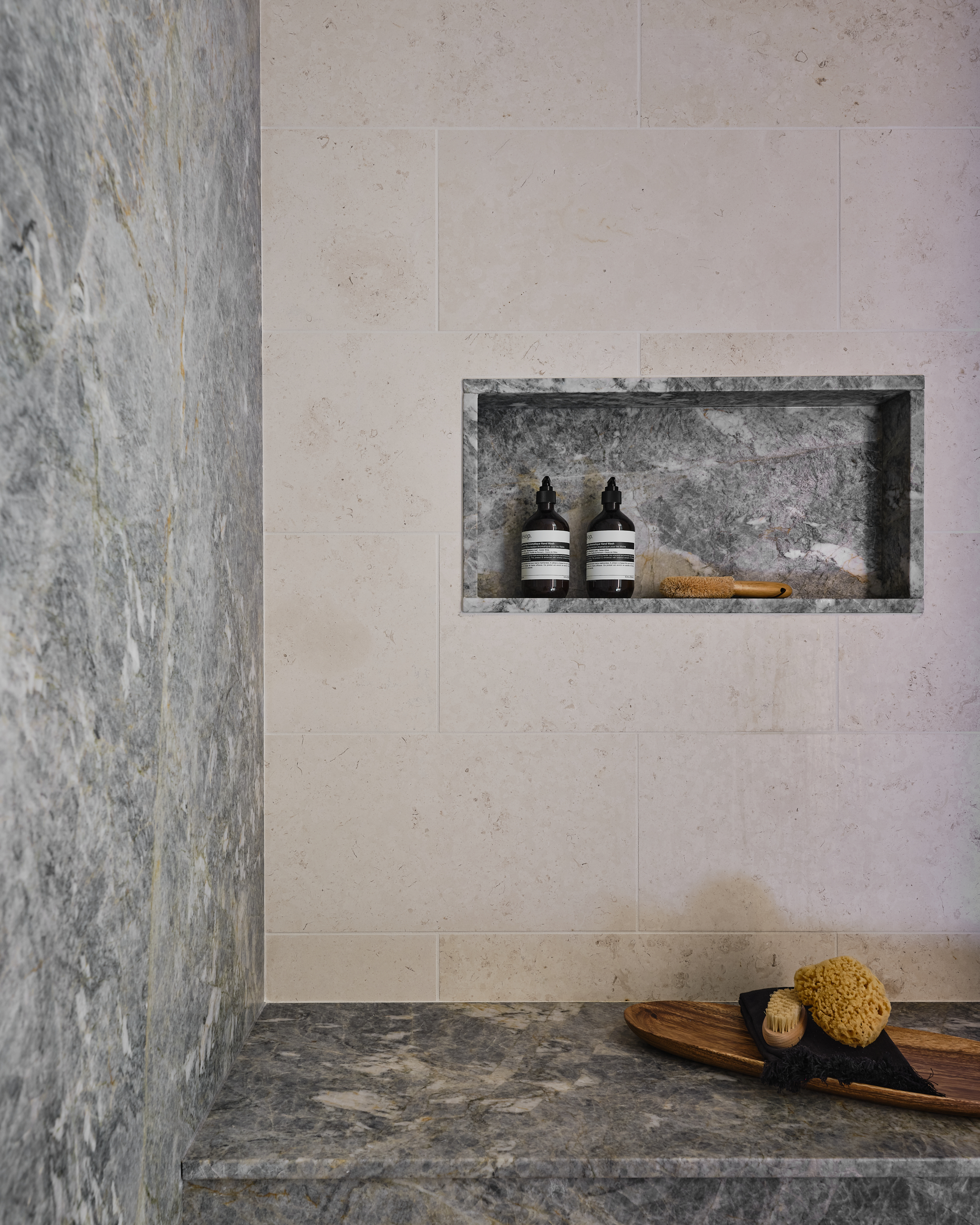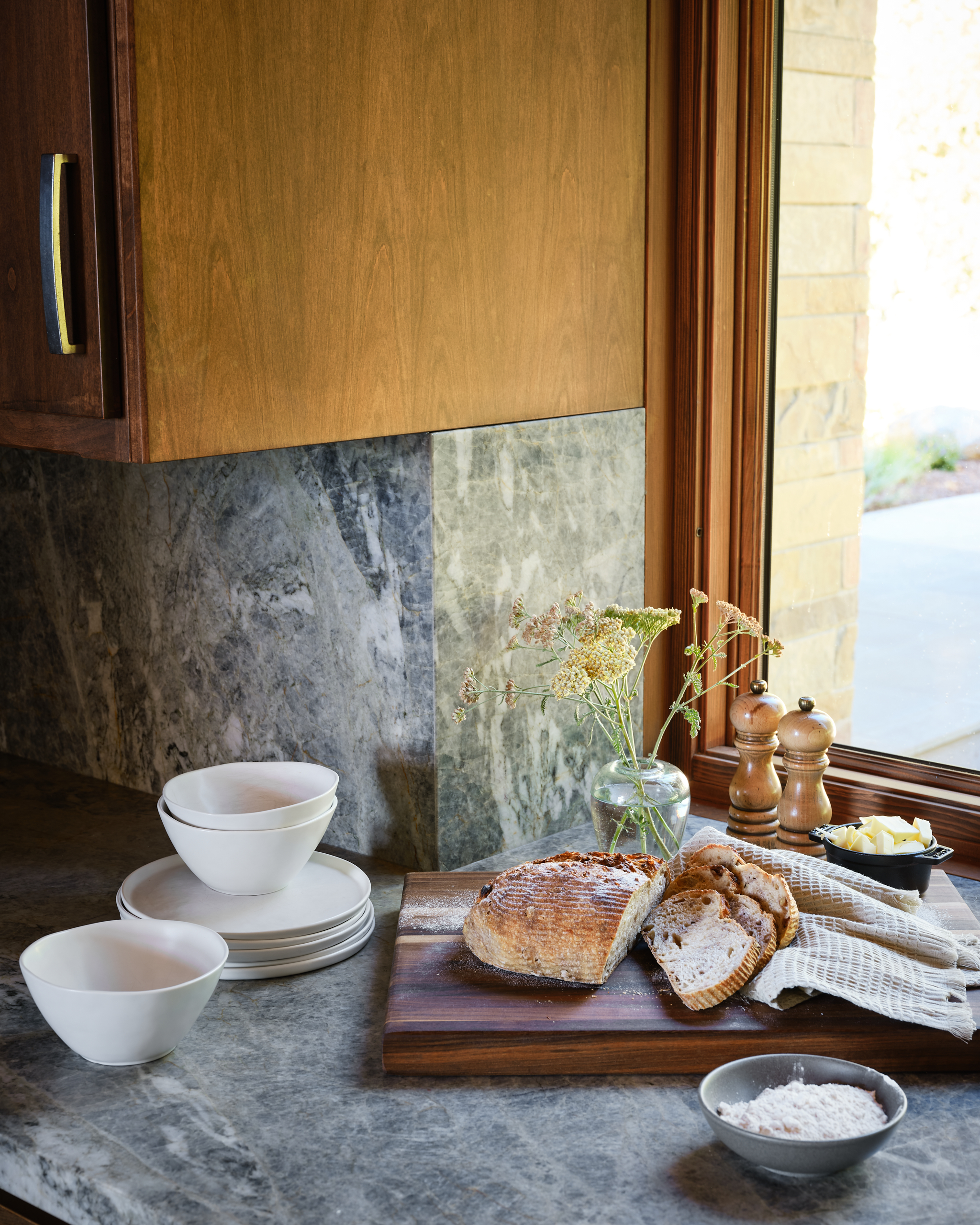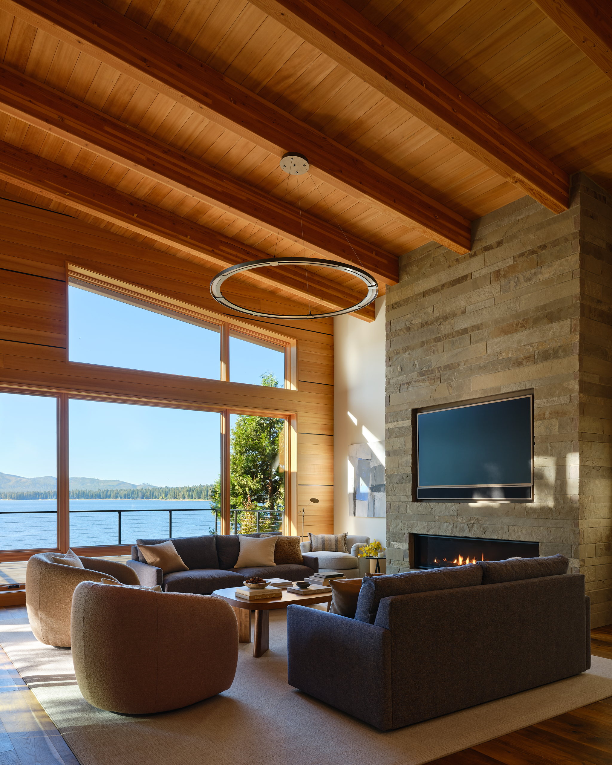 Inside, high wood-beamed ceilings, a stone fireplace, and floor-to-ceiling windows create a warm and open atmosphere. Natural materials and simple, elegant decor make this home a peaceful and stylish retreat on the lake.