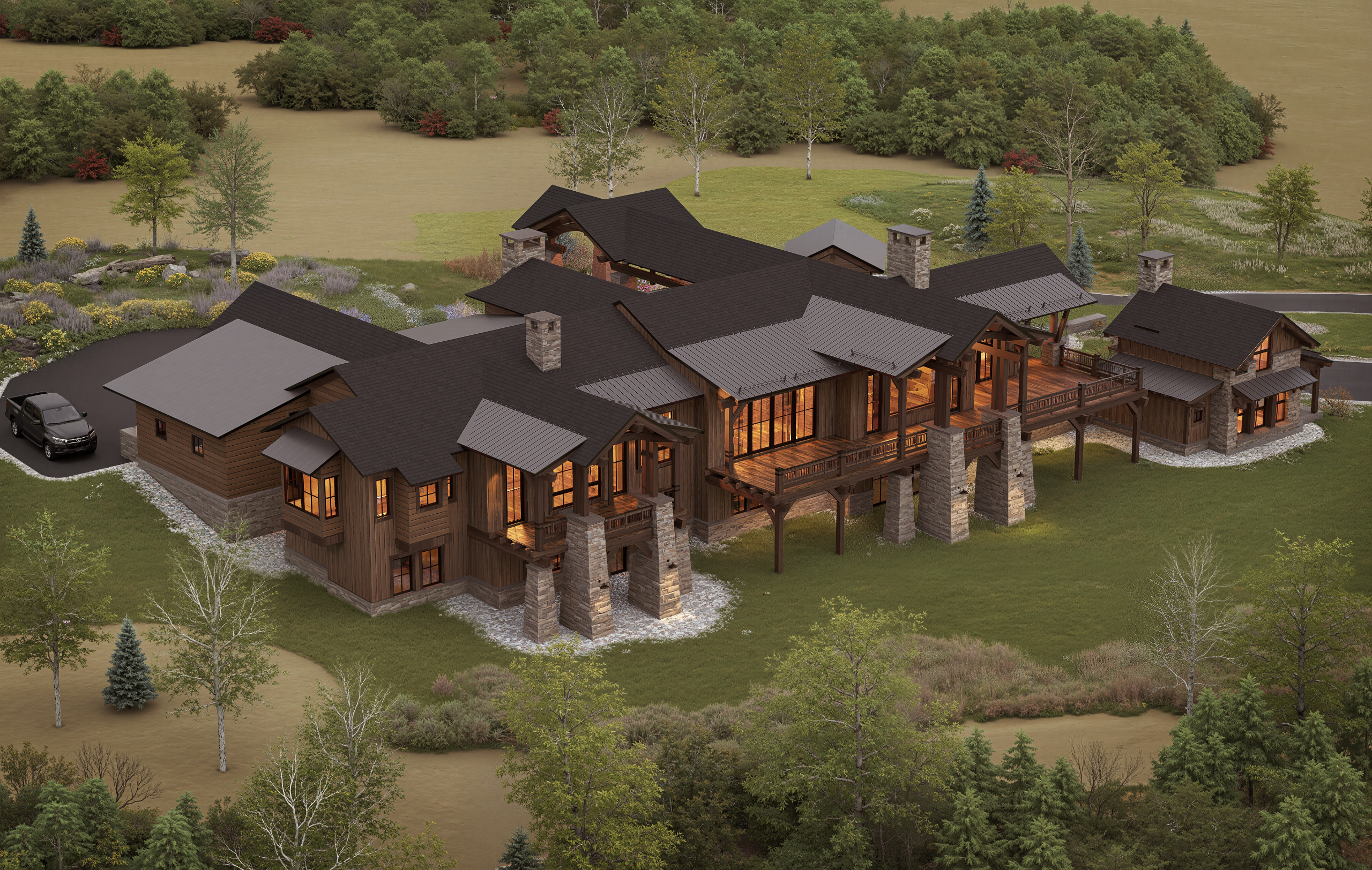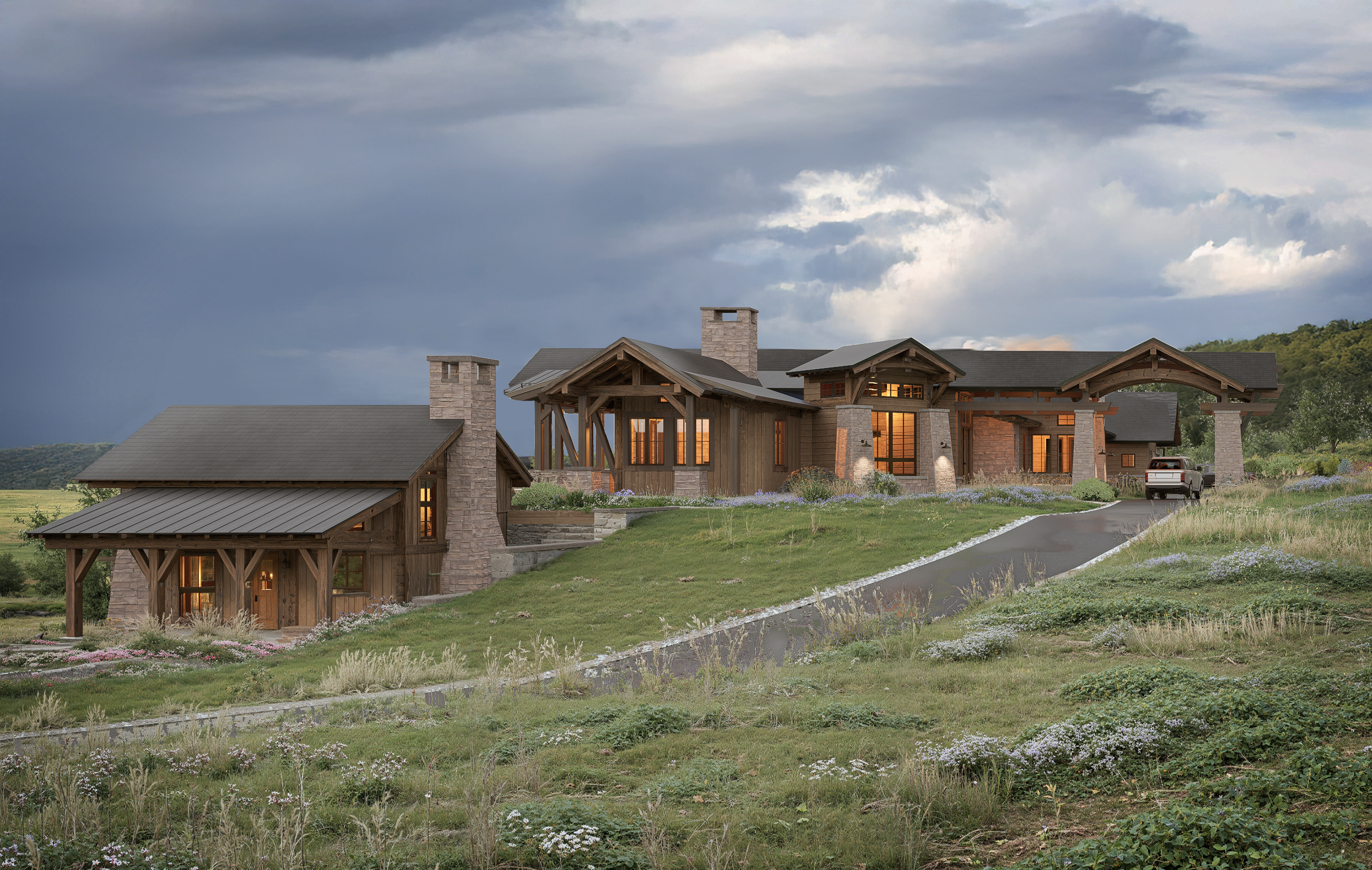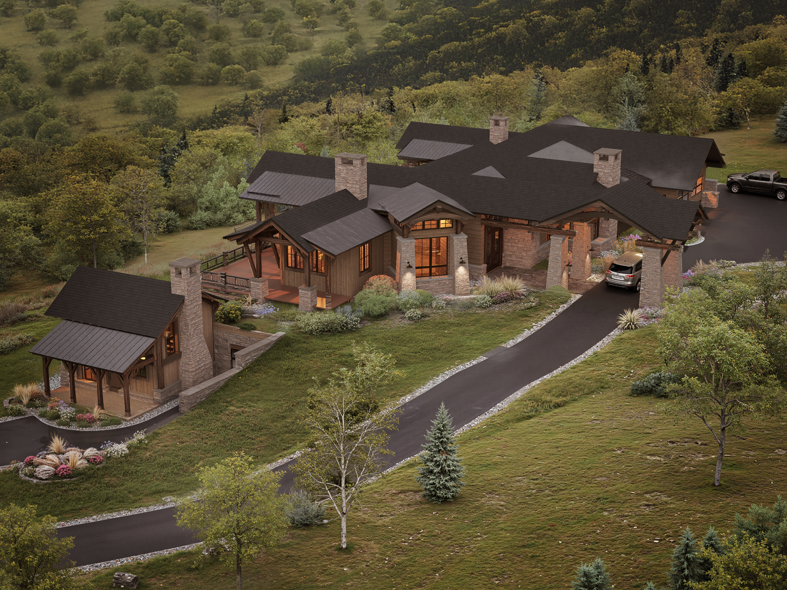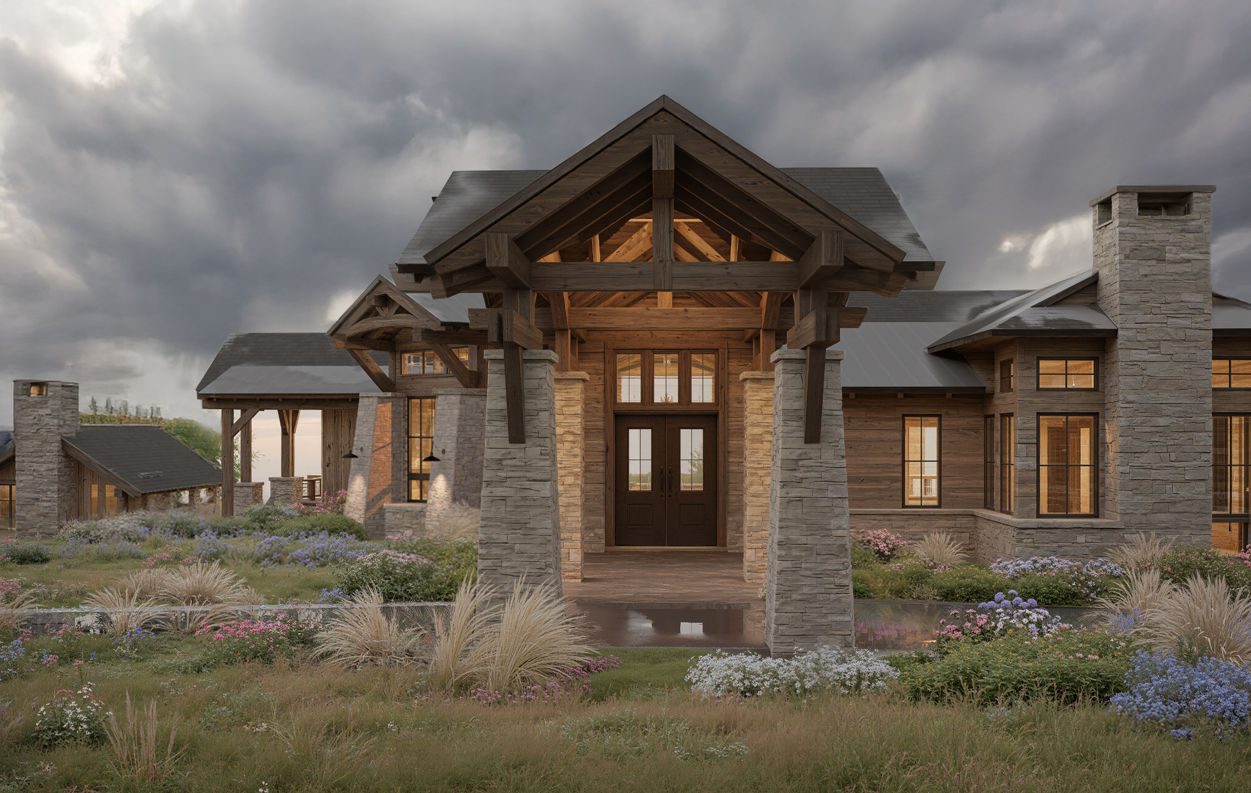 The architectural character is rooted in a robust timber-frame structure, expressed through exposed beams, sculptural trusses, and warm natural materials. Rich stonework rises from the landscape, anchoring the home visually and structurally, while broad windows and clerestories invite natural light deep into the interior. The interplay of timber, stone, and glass creates a timeless alpine aesthetic—both rugged and elegant.